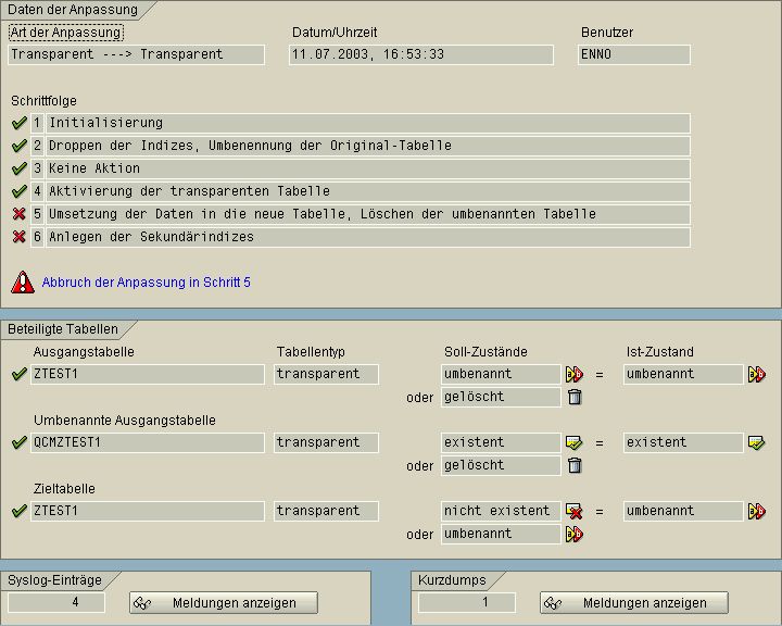 Unten sehen Sie den Punkt “Umbenannte Ausgangstabelle”. Hier steht der Name der Schattentabelle. Da diese Tabelle nur auf der Datenbank existiert, aber nicht im R/3-Dictionary angelegt ist, können Sie die Tabelleninhalte mit der Transaktion SE16 nicht anzeigen lassen!